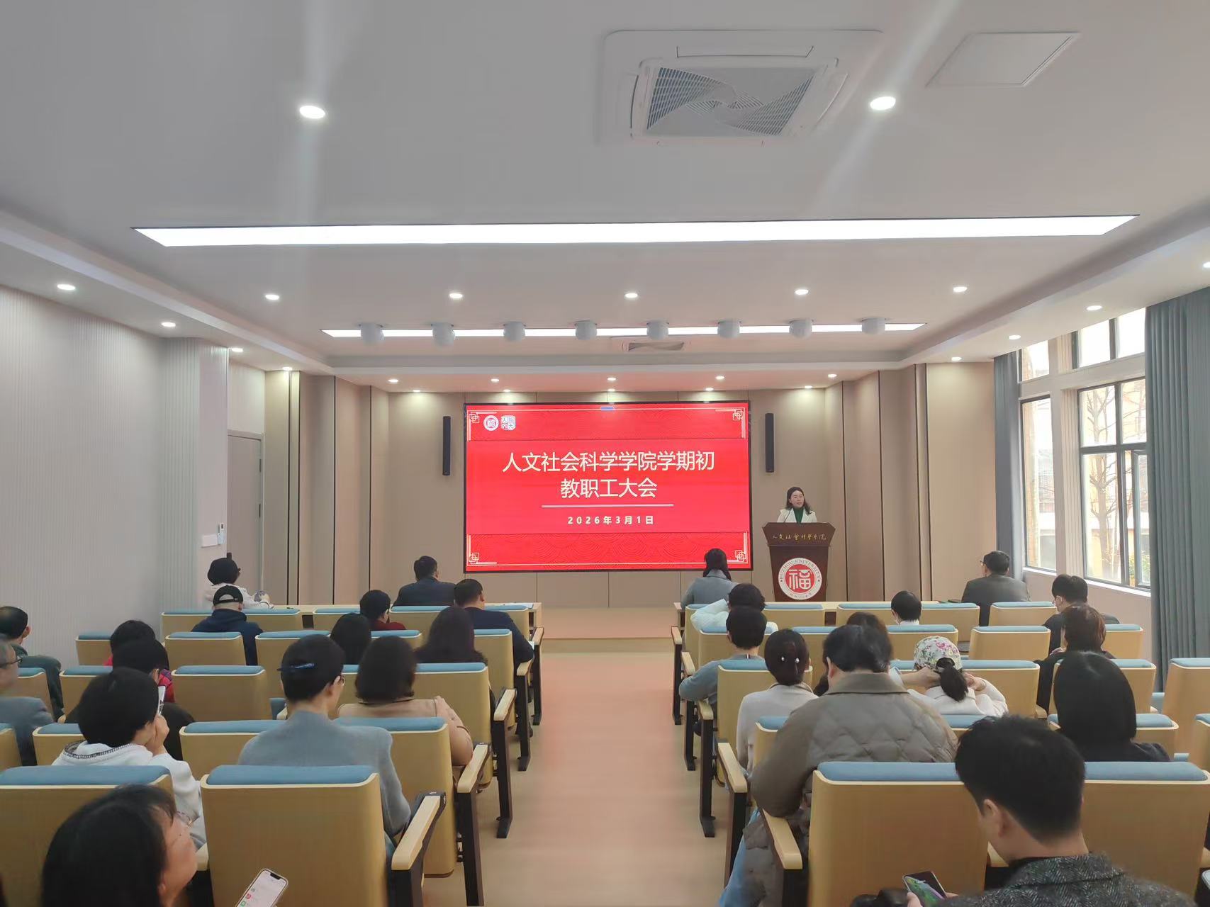 2026年3月1日下午,人文社会科学学院学期初全院教职工大会在学院213报告厅举行。会议由学院党委书记刘玮主持,学院党政领导班子全体成员及全院教职工参加会议。
