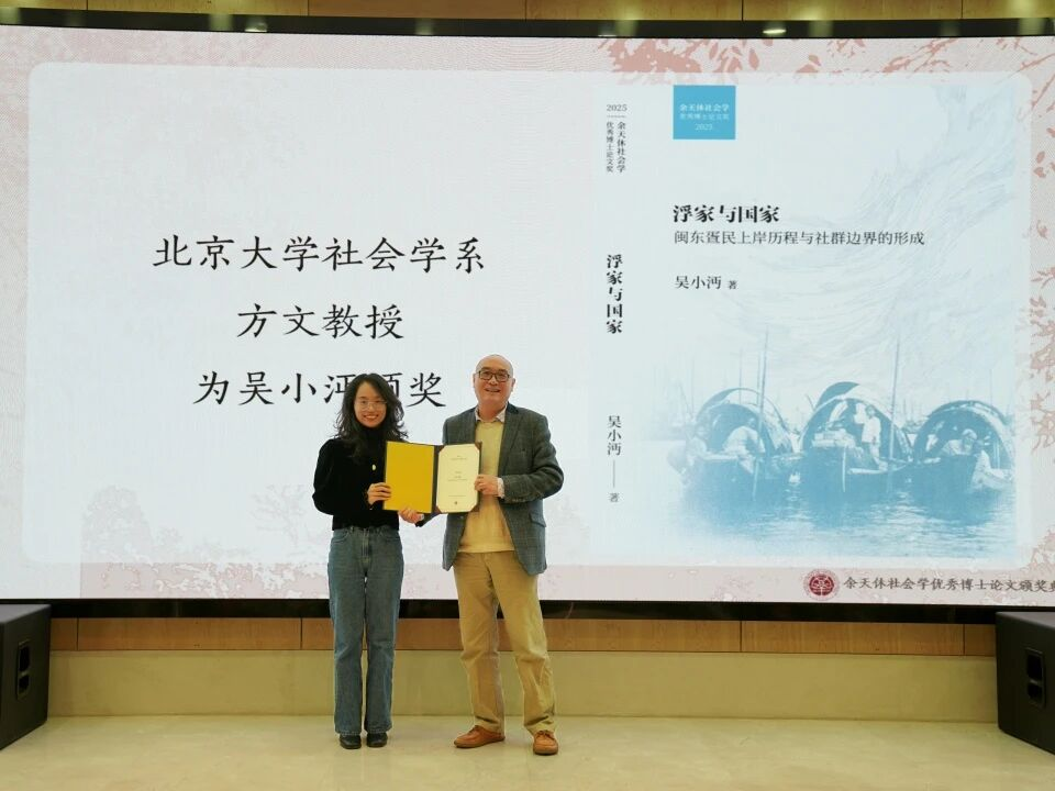 2025年11月1日,第九届“余天休社会学优秀博士论文奖”颁奖典礼在北京大学举行。我院社会学系吴小沔副教授凭借论文《浮家与国家:闽东疍民上岸历程与社群边界的形成》荣获该奖。
