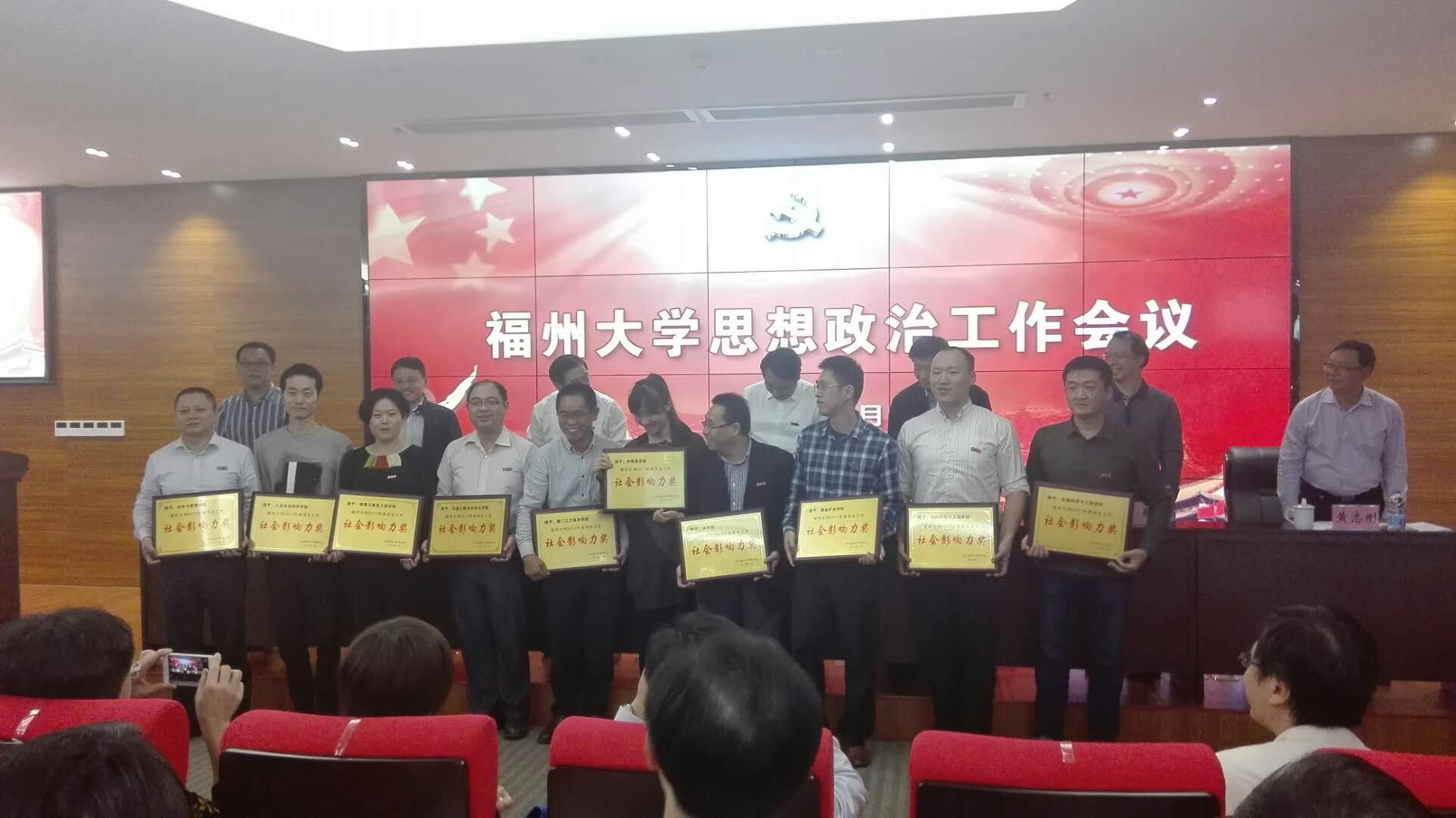 最近,校党委为表彰我院在文明校园创建、新闻宣传、学生管理等工作中做出的积极贡献与优异成绩,授予我院“2015-2017年度福州大学文明校园创建工作先进单位”、“新闻宣传工作先进集体”、“学生工作社会影响力奖”,并授予我院王薇薇老师“新闻宣传工作先进个人”等集体和个人荣誉称号。