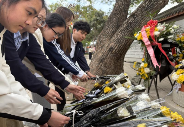 随后,同学们手持鲜花,缓步登阶来到革命烈士纪念碑前,行祭拜礼并献上花束。礼毕,大家移步烈士英名墙,依次向英名墙深深鞠躬,表达对革命先烈的深切哀思与崇高敬意。
