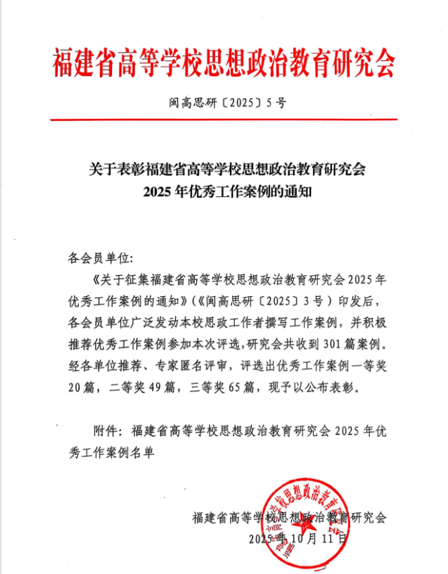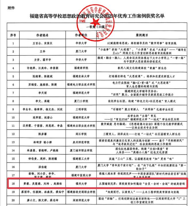 近日,福建省高等学校思想政治教育研究会公布2025年优秀工作案例获奖名单。由我院党委书记刘玮、院长吴慧娟、党委副书记赵燕松、辅导员黄薇撰写的参评案例《从围墙到无界:高校美育如何撬动“全员·全时·全城”的破局密码》荣获一等奖!